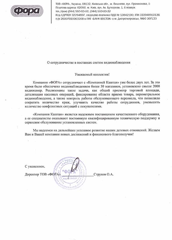 Обратились в компанию "Каштан" для установки системы видеонаблюдения. В тот же день к нам на объект приехал специалист, привез с собой примеры оборудования и произвел все необходимые замеры. На следующий день мы получили смету и заключили договор. Установка заняла не более 2-х дней. Все было выполнено профессионально и оперативно. Как результат, за месяц работы системы мы смогли предупредить более 10 краж и сохранить товар на сумму 14 000 грн.